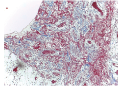 El tejido estudiado consta de una estructura de aspecto hemorrágico de 8 ´ 6 ´ 2 cm de superficie lobulada.