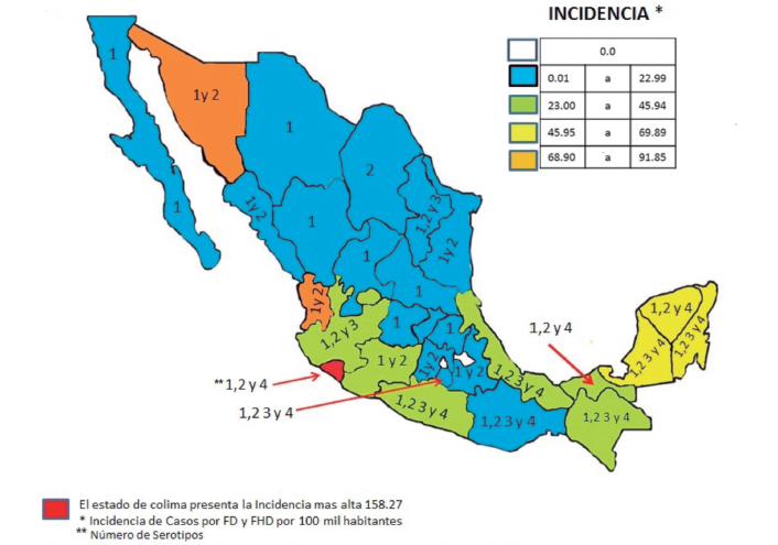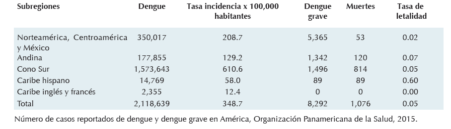 En el informe de la Organización Panamericana de la Salud de la semana epidemiológica 45 del 2015, sobre casos de dengue y dengue grave descritos, se aprecia a México en tercer lugar con 196,601 casos, justo después de Colombia y Brasil. En la región de Norteamérica y Centroamérica, México es el país con más casos informados, seguido de El Salvador y Honduras. Acerca de los casos de dengue grave, la Organización Panamericana de la Salud señala a México con el mayor número de casos en América, probablemente por ser uno de los pocos países con cuatro serotipos de virus del dengue en circulación.18-9 Los países que presentan cocirculación de los cuatro serotipos son: México, Guatemala, Nicaragua, Colombia, Venezuela, Guyana Francesa, Guadalupe, Brasil, Perú y Argentina20 (Figura 4).
