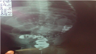 A la exploración física se encontró en malas condiciones generales: pálido, hipoactivo, hiporreactivo y deshidratado, abdomen distendido, dolor generalizado, rebote positivo, peristalsis disminuida, cardiopulmonar sin compromiso, al tacto rectal se observó salida de abundante gas y materia fecal líquida y escasa, sin sangre, resto de la exploración normal. Los estudios de laboratorio reportaron leucocitos de 3,900, neutrófilos 25%, linfocitos 49.9%, hemoglobina de 9.9 g/ dL, hematocrito de 29.4%, plaquetas 46,0000, tiempo de protrombina de 17 segundos, tiempo de tromboplastina parcial de 69 segundos, sodio 138 mEq/L, potasio 4.8 mEq/L y cloro 103 mEq/L. La radiografía simple de abdomen reveló múltiples niveles hidroaéreos, opacidad pélvica sin aire libre subdiafragmático (Figura 1). El colon por enema mostró disminución del calibre del recto y presencia del “borde en serrucho” y la radiografía de control de 48 horas con medio de contraste e imagen de “borde de serrucho” aun visibles (Figura 2).