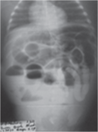 La evolución del menor fue mala, persistiendo con patrón pulmonar restrictivo debido a la distensión abdominal, caracterizado por taquipnea, hipertensión arterial y edema generalizado. Dada la evolución fue nuevamente sometido a laparotomía con diagnóstico de enfermedad de Hirschsprung, encontrándose dilatación importante del íleon terminal, válvula ileocecal fibroedematosa por lo que se practicó ileostomía; evolucionando con remisión de la respuesta inflamatoria sistémica aguda por lo que se le dio la vía oral al séptimo día de postoperatorio.