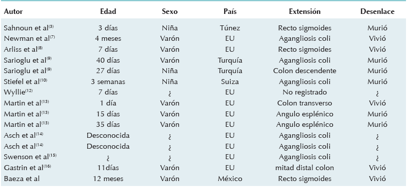 En la revisión de la literatura sólo existen reportados, hasta el día de hoy, 14 casos de apendicitis con enfermedad de Hirschsprung12,13,14,15,16 y la condición predomina en el sexo masculino, es más común la aparición en el periodo neonatal y de afectación mayoritaria de la totalidad del colon, la que se presentó en seis de los 14 casos conocidos. Diez del total fueron publicados en Estados Unidos. De los doce casos en que conocimos el pronóstico, la mitad murió.