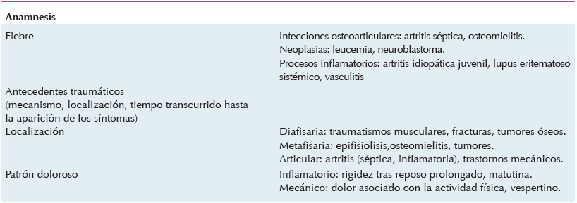 En la anamnesis se preguntará, además de los antecedentes familiares y personales, por el tiempo de evolución del dolor, ya que esto puede ayudar al diagnóstico. Síntomas de inicio agudo pueden sugerir una enfermedad aguda como artritis séptica, osteomielitis, fractura o malignidad. Se interrogará además por antecedentes traumáticos significativos (se entienden como tales aquellos que producen dolor, impotencia funcional, tumefacción o hematoma inmediatamente después o en las primeras 24 horas después del traumatismo). Es importante averiguar si el dolor es constante o intermitente, los síntomas matutinos que mejoran a través del día son más sugestivos de etiología reumatológica. El dolor después de la actividad es sugestivo de síndrome por sobreuso o fractura por estrés. El dolor que provoca despertar nocturno puede tener una etiología benigna como dolores de crecimiento o etiología más seria como malignidad u osteoma osteoide. En los niños que ya hablan se debe interrogar la localización y tipo de dolor. También se debe constatar la duración de los intervalos sin síntomas y si hubo evaluaciones previas por el mismo motivo u otro similar.