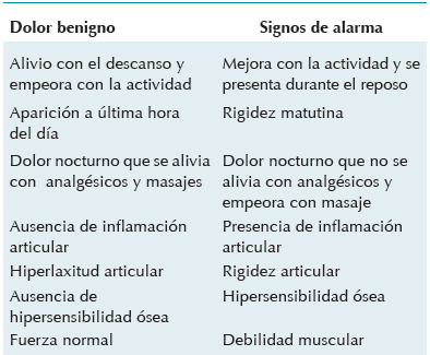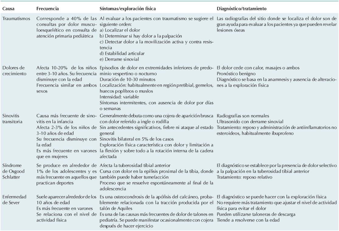 Las patologías de mayor gravedad generalmente causan síntomas sistémicos, por lo cual se debe interrogar acerca de fiebre, así como su tiempo de duración, asociación con rash, pérdida de peso, limitación en la actividad física, hiporexia, cambio en el patrón del sueño (Cuadro 2). A continuación se describen las causas más frecuentes de dolor musculoesquelético en la edad pediátrica (Cuadro 3):