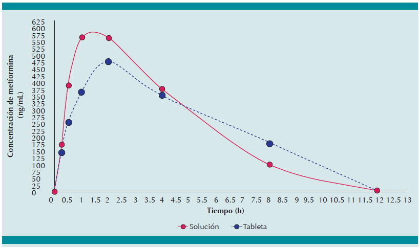 Del mismo modo, el perfil farmacocinético que se muestra en la Figura 1 sugiere que la eliminación de la metformina en forma disuelta fue sostenida y lineal, a diferencia de la tableta, que se eliminó de forma más abrupta. No obstante, las áreas bajo la curva (AUC0-12 y AUC0-12) de ambas formas farmacéuticas tienen valores muy similares, es decir, que son hasta 50 veces más similares entre sí que los demás parámetros farmacocinéticos.