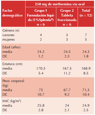 Comparar la farmacocinética de metformina en formulación líquida edulcorada sin calorías (con sucralosa a 1%) por vía oral, previamente desarrollada en nuestro laboratorio,20 con la de la tableta de 500 mg fraccionada a la mitad, en voluntarios adultos sanos, para demostrar que el comportamiento farmacocinético de la metformina tiene cambios insignificantes tras modificar su presentación.