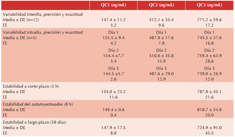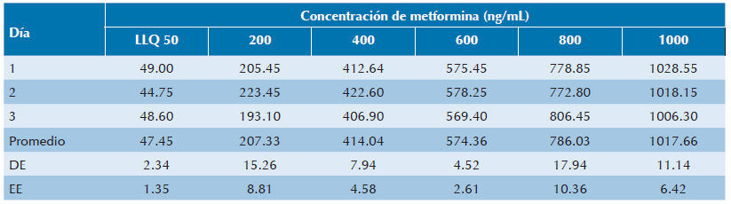 El método desarrollado y validado en este trabajo para la cuantificación de niveles plasmáticos de metformina demostró ser lineal en el intervalo de concentraciones desde 50 hasta 1,000 ng/mL. La curva de calibración, para cuantificar la cantidad de fármaco de muestras problema, tuvo las siguientes concentraciones: 50, 200, 400, 600, 800 y 1,000 ng/mL, con un límite inferior de cuantificación de 50 ng/ mL (Cuadro 2). Se obtuvo un coeficiente de determinación (r2) de 0.998035. La variabilidad intra- e interdía no fue considerable y el método fue preciso y exacto, con coeficientes de variación menores a 7.5% (Cuadro 3). Las muestras extraídas y almacenadas a 4°C fueron estables por 17 horas. Asimismo, estables hasta 15 horas en automuestreador (15oC) y hasta 2 meses a -80°C.