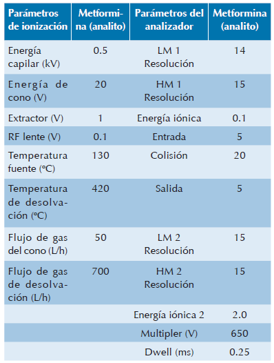 En la Cuadro 4 se describen las condiciones espectrométricas del método, que describen el protocolo de detección de metformina por cromatografía líquida de ultradesempeño y espectrometría de masas en tándem.