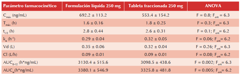 La ke fue menor con la forma líquida (0.29 vs. 0.32 h-1), lo que sugiere que se eliminó más rápidamente. El AUC0-12 fue igual en ambas formas (F=0.002, Fcrit=6.3).