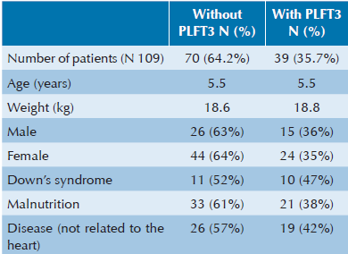 Variables as age, nutritional status, CPB time, complexity of heart’ malformation and the presence of associated genetic syndromes, have been found to be related with the development of PLFT3; its incidence in different series, varies from 10 to 30%.6,7,9