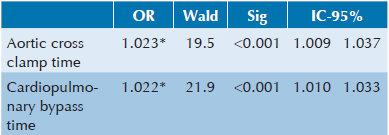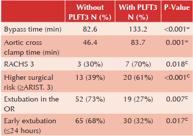 Patients with PLFT3 were could not be extubated early (considering a 24 hourperiod) as compared with patients without PLFT3 (p=0.003) (Table 2). Logistic regression model for aortic cross clamp time showed an odds ratio (OR) of 1.023, meaning that for every extra minute of aortic cross clamp, there was a 2.3% higher probability for patients to develop PLFT3.