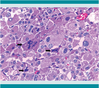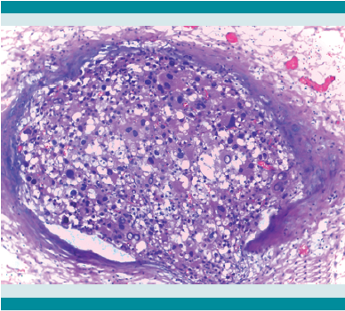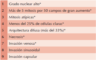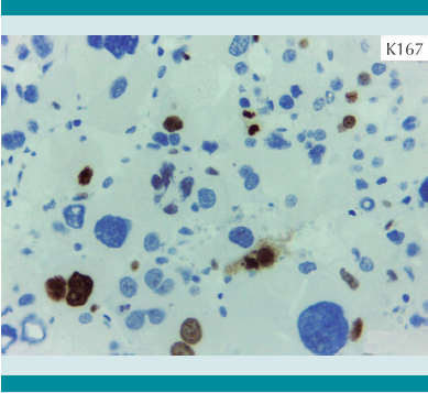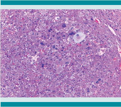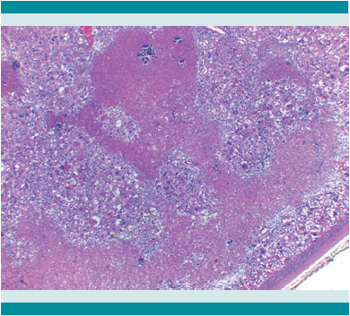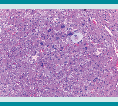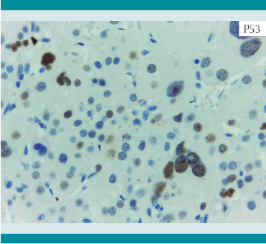 El tumor pesó 30 gramos y midió 5 × 4 × 4 cm. En la cápsula se identificaron vasos delgados visibles (Figura 1). Al corte, el tumor se apreciaba multinodular de consistencia blanda y color blanco grisáceo con áreas amarilla naranja (Figura 2). Microscópicamente, el tumor estaba constituido por células grandes con acentuado pleomorfismo y abundante citoplasma eosinófilo (Figura 3). La neoplasia comprime la corteza suprarrenal por debajo de la cápsula (Figura 4). A mayor aumento es más evidente el pleomorfismo y desde el punto de vista arquitectural el patrón es difuso (Figura 5). Hay mitosis atípicas (Figura 6) y se encuentran más de 5 mitosis por 50 campos de gran aumento. La necrosis presente como áreas eosinófilas en patrón geográfico se identifican en varios de los campos microscópicos (Figura 7). La permeación vascular es uno de los principales criterios de malignidad en los carcinomas de corteza suprarrenal; en la siguiente imagen se ilustra un vaso con un gran agregado tumoral en su luz (Figura 8). Por inmunohistoquímica se encontró un importante índice de proliferación celular, con un Ki67 de 20% que se expresa Figura 3.Microscópicamente se observan células grandes con acentuado pleomorfismo y abundante citoplasma eosinófilo. como positividad nuclear (Figura 9). La proteína p53 igualmente se expresa en forma nuclear en una proporción del 30% (Figura 10). Los criterios histopatológicos de Weiss para caracterizar neoplasias adrenocorticales malignas se ilustran en el Cuadro 2. El tumor que presentamos reúne 7 de los 9 criterios (*).