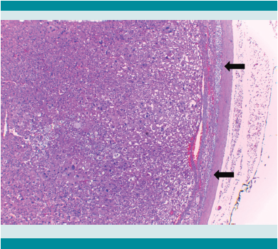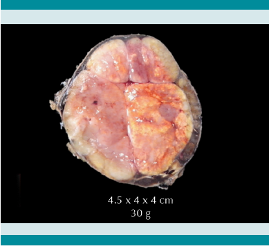 En esta paciente la tumoración fue resecada en su totalidad y el estudio histopatológico confirmó carcinoma de la corteza suprarrenal con permeación vascular.