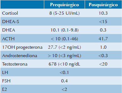 El perfil hormonal prequirúrgico confirmó hiperandrogenismo con niveles muy elevados tanto de testosterona como de sus precursores: 17 hidroxi-progesterona, androstenediona y deshidroepiandrosterona (DHEA). Estas hormonas actúan en los cuerpos cavernosos del clítoris y son responsables de la clitoromegalia y de los otros datos de virilización de la paciente.