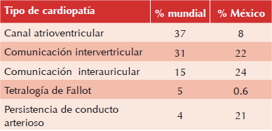 Cerca de 50% de los pacientes con síndrome de Down tiene una cardiopatía congénita.8 En uno de los estudios poblacionales más grandes las malformaciones más frecuentes fueron canal atrioventricular completo, comunicación interventricular, comunicación interatrial, tetralogía de Fallot y persistencia del conducto arterioso.34 Datos en población mexicana indican una prevalencia de cardiopatías congénitas (en el síndrome de Down) de 58%; sin embargo, en contraste con los informes a nivel mundial el canal atrioventricular completo muestra una frecuencia mucho menor que las comunicaciones interventricular e interatrial (Cuadro 2).35 En 2008, el National Down Syndrome Project of United States of America encontró que ser descendiente de hispanos confiere una oportunidad relativa de 0.48 para canal atrioventricular completo.36