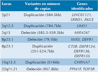 Dentro de las variantes en número de copias del cromosoma 21 asociadas con cardiopatía están algunas duplicaciones que involucran a regiones reguladoras del gen RIPK4 (21q22.2), el cual se ha asociado con morfogénesis epitelial (RR: 2.29) y del gen ZBTB21 que participa en la regulación de la vía de señalización de WNT/beta-catenina, vía requerida para la diferenciación cardiaca de células embrionarias (RR: 1.84). Además, se han identificado variantes en número de copias fuera del cromosoma 21, sobre todo regiones previamente asociadas con cardiopatías congénitas no sindromáticas. Este grupo afecta a genes del cilioma, el cual es un componente crítico de la septación atrioventricular39 (Cuadro 3).