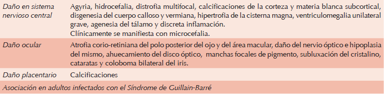 Las consecuencias de la infección en el producto de la gestación se presentan en el Cuadro 2. Las lesiones anatómicas que se han desarrollado en el producto de la gestación cuando su madre ha sufrido la infección por el virus del Zica, tiene como órganos blanco el sistema nervioso central, los ojos y la placenta.