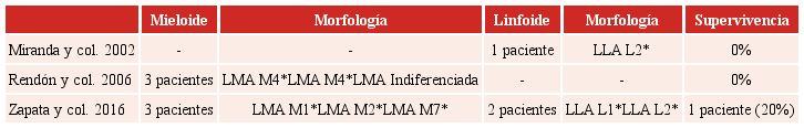 La leucemia mieloide aguda fue más frecuente con tres casos. En ninguno de los casos se reportó alguna translocación o alteración citogenética de alto riesgo. En el Cuadro 2 se muestran las características clínicas, de laboratorio, la clasificación de la leucemia, el tratamiento, la supervivencia y las complicaciones de estos cinco pacientes reportados.