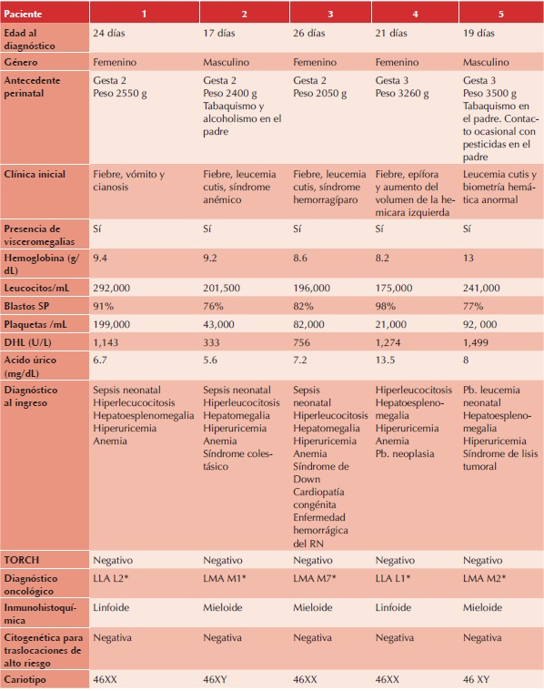 Durante el periodo mencionado se diagnosticaron 3,061 leucemias, de las cuales solo cinco casos (0.16%) representaron pacientes diagnosticados en la etapa neonatal. En esta serie reportamos cinco casos de leucemia neonatal, tres del sexo femenino y dos masculinos con edad media al diagnóstico de 21 días de vida, con una edad mínima de 17 días y máxima de 26 días.