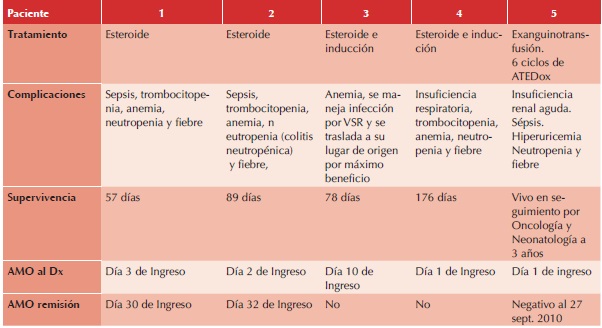Cuatro pacientes recibieron manejo para lisis tumoral con alopurinol, medicamento base del tratamiento de esta complicación metabólica; sin embargo, no descrito de manera sistemática en la etapa neonatal. Solo un paciente (caso cinco) completó el ciclo para leucemias mieloides con citarabina (Ara-C), 6- mercaptopurina (6-MP), etopósido (VP-16), doxorrubicina y metotrexate (ATEDoxNOPHO al 50%) con remisión documentada por aspirado de médula ósea. Durante su seguimiento por consulta externa de oncología se reportó un nuevo aspirado de médula ósea en remisión posterior al cual los padres rechazaron el tratamiento de mantenimiento y se pierde su seguimiento. Regresa a la edad de tres años refiriéndose biometrías hemáticas normales hasta ese momento. Existen casos reportados en todas las edades de pacientes que después de entrar en remisión pueden tener supervivencias prolongadas.