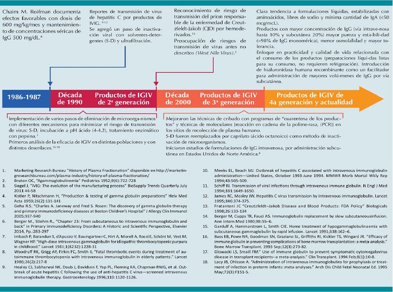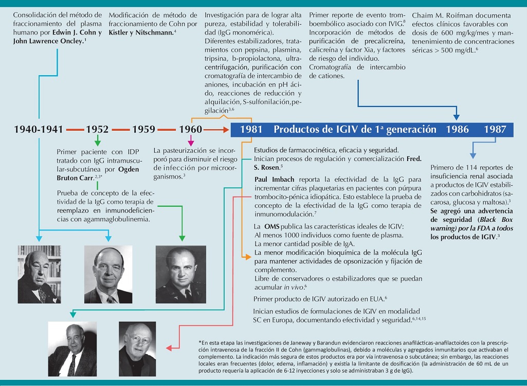 Después del desarrollo inicial del método de fraccionamiento de plasma humano, por el profesor Edwin Cohn a principios del decenio de 1940, además de los avances científicos y tecnológicos, se han incorporado múltiples mejoras en el proceso industrial de la IgG y de esta forma han permitido obtener productos con mayor eficacia clínica, cada vez más puros, estables y seguros.4 La Figura 1 muestra los acontecimientos iniciales en la indicación de la IgG y la evolución de las formulaciones comercialmente disponibles.