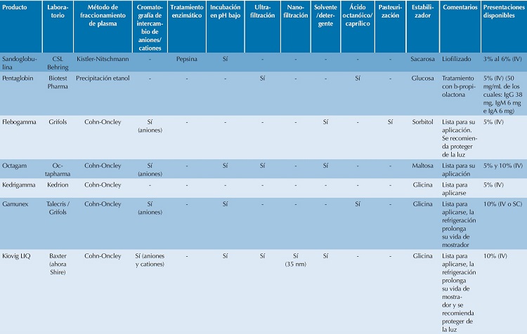 En el Cuadro 1 se muestran los productos de IgG aprobados por la COFEPRIS y sus características más importantes.