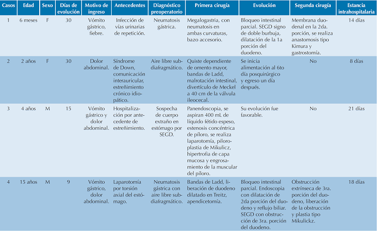 The 4 patients presented similarities in the symptomatology, such as vomiting, fever and abdominal pain. Cases 2 presented as a personal pathological antecedent Down syndrome, and the case 4 presented history of exploratory laparotomy caused by axial torsion of the stomach. Cases 1 and 4 underwent a second surgical intervention due to intestinal obstruction. 1 patient was a voluntary discharged.