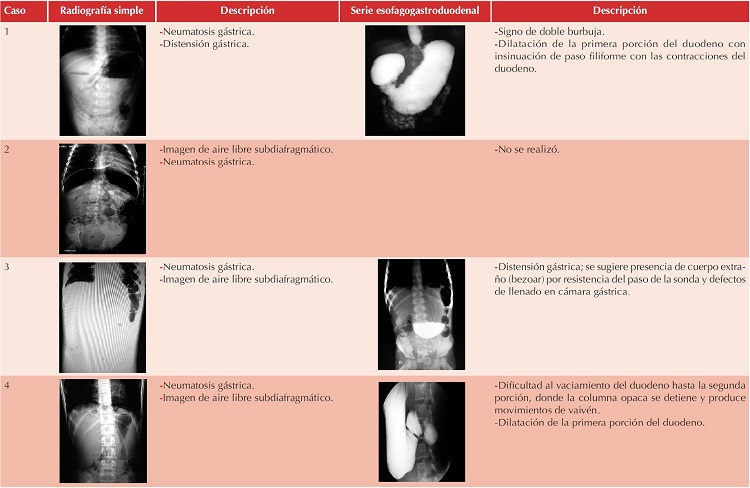 En el Cuadro 1 se resumen los cuatro casos clínicos analizados y en el Cuadro 2 los estudios de imagen realizados para el diagnóstico de neumatosis gástrica.