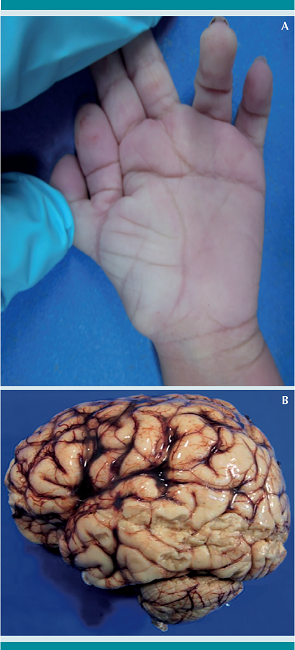 Esta niña llegó a la autopsia en estado caquéctico, con hipotrofia muscular generalizada; pesaba 4 kg con una talla de 61 cm. Tenía la facies característica de síndrome de Down con epicanto, aplanamiento del dorso de la nariz, pliegue palmar único en ambas manos y un pulgar supernumerario en la mano izquierda. (Figura 2A)