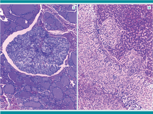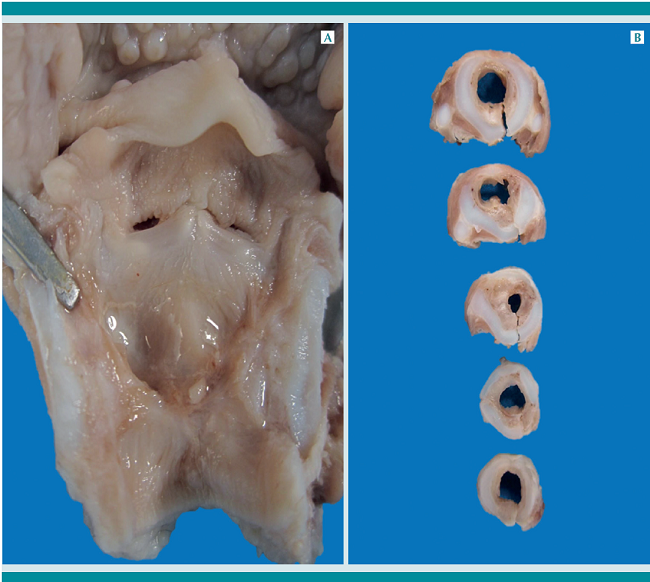 Los pacientes con síndrome de Down, portadores de anomalía cromosómica en todas las células de su economía, presentan una diversidad de anomalías, malformaciones y disfunciones en muchos aparatos y sistemas que reflejan un desarrollo de estructuras orgánicas y tisulares que se aleja de la norma. En esta niña la malformación cardiaca, que se discute más adelante, concentró la atención durante su curso clínico, pero en la autopsia encontramos alteraciones tisulares menores como una glándula paratiroides intra-tiroidea, no necesariamente anormal pero no habitual, y había en el seno del parénquima hepático inclusiones de tejido de la adrenal adyacente, seguramente sin ninguna repercusión clínica. (Figura 3) Un bronquio traqueal, que puede asociarse con el síndrome de Down y que fue identificado en vida, aumenta el riesgo de neumonías recurrentes y cuadros de aspiración, como probablemente sucedió a la paciente. (Figura 4A)
