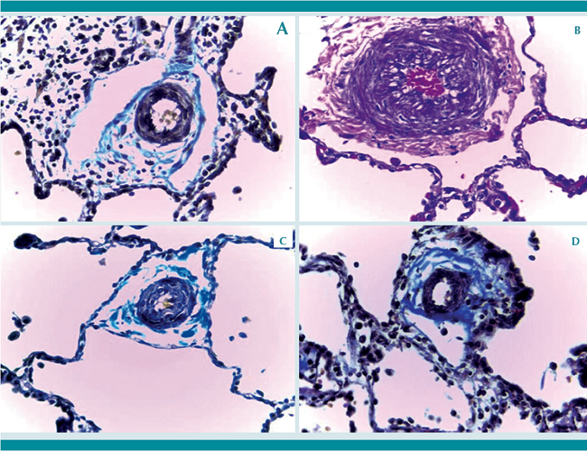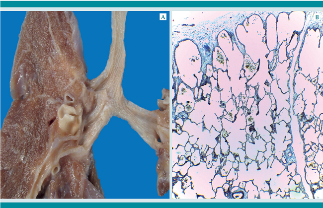 Más importante es la reconocida inmadurez pulmonar característica del niño con Down, con una menor población de alvéolos y un retraso en el desarrollo de la vascularidad pulmonar.7 (Figura 4B) Esto propicia el desarrollo de una hipertensión pulmonar grave, que fue lo que encontramos en esta niña; en todo el árbol arterial pulmonar se aprecia hipertrofia marcada de la capa muscular con disociación de las fibras elásticas; la microvascultura pulmonar mostraba arteriolización de los capilares intra-acinares con duplicación de la lámina elástica. (Figura 6)