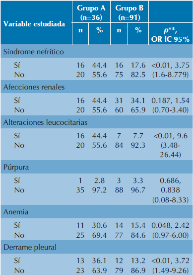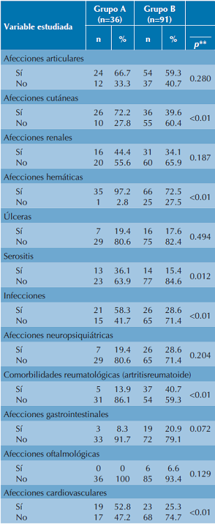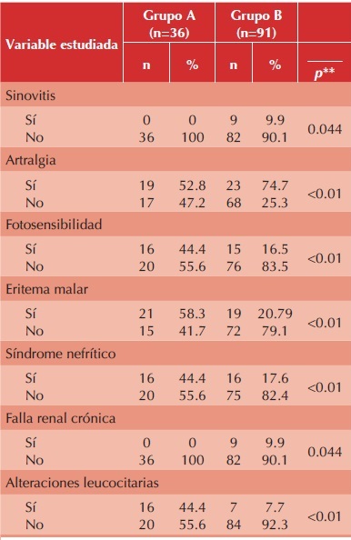 MATERIALS AND METHODS: We reviewed 127 clinical records of patients diagnosed with SLE, 36 patients were from a paediatric hospital (group A) and 91 from a general hospital (group B). The variables explored included the clinical manifestations in children at diagnosis and those of adults as well as the comorbidities related to the disease and mortality, according criteria from American College of Rheumatology, also the type of medication used. The statistical procedures were frequencies and percentages, chi-squared test, Fisher’s exact test, odds ratios and confidence intervals.