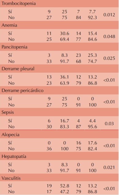 La alopecia predominó en los adultos (p< 0.01). No se reportaron casos de niños con mialgias, síndrome de Sjögren, dermatopolimiositis, artritis reumatoide, esclerosis nodular, síndrome de CREST, ni hipotiroidismo, y tuvieron una menor frecuencia de manifestaciones del fenómeno de Raynaud, al compararlos con los adultos (8.3% en niños contra 15.4% en adultos) p= 0.22. Se encontró una mayor frecuencia en niños de síndrome antifosfolípidos (2.8% contra 1.1%, p= 0.48).