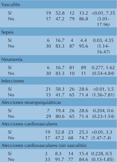 Se procuró estimar el riesgo de los niños a presentar determinadas manifestaciones clínicas a través de la razón de momios (OR) y se observó que aquellas asociadas con mal pronóstico son más frecuentes en niños y con mortalidad en pacientes con LES según otros estudios.6-13 Tuvimos: síndrome nefrítico (OR = 3.75; IC 95%: 1.6-8.7), alteraciones hematológicas, leucopenia (OR = 9.6; IC 95%: 3.4-26.4), derrame pleural (OR = 3.72; IC 95%: 1.49-9.26), vasculitis (OR = 7.35; IC 95%: 3.01-17.96), sepsis (OR = 4.35; IC 95%: 1.14-16.47), infecciones (OR = 3.5; IC 95%: 1.56-7.81) y afecciones cardiovasculares (OR = 3.3; IC 95%: 1.47-7.4 (Cuadro 3).