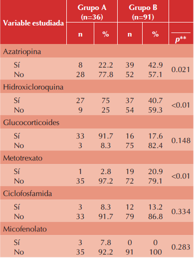 Se encontraron relaciones significativas entre el grupo etario y el uso de algunos inmunosupresores como tratamiento para el LES. Los valores encontrados para el uso de fármacos en los niños fue como se detalla a continuación: parahidroxicloroquina (p< 0.01), glucocorticoides (p= 0.14) y micofenolato (p= 0.28) azatioprina o ciclofosmfamida dependiendo de la presencia de afección renal. Por su parte, en los adultos los tratamientos fueron con base de azatioprina (p= 0.02), metotrexato (p< 0.01) y ciclofosfamida (p= 0.33) (Cuadro 4).