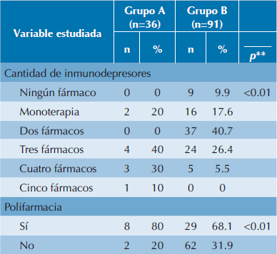 Los niños recibían entre tres y cuatro inmunosupresores en comparación con dos de los adultos (p< 0.01). Los niños con LES tienen ocho veces más riesgo de presentar el síndrome de polifarmacia que los adultos con la misma enfermedad (OR = 8.5; IC 95%: 1.7-42.8) (Cuadro 5).
