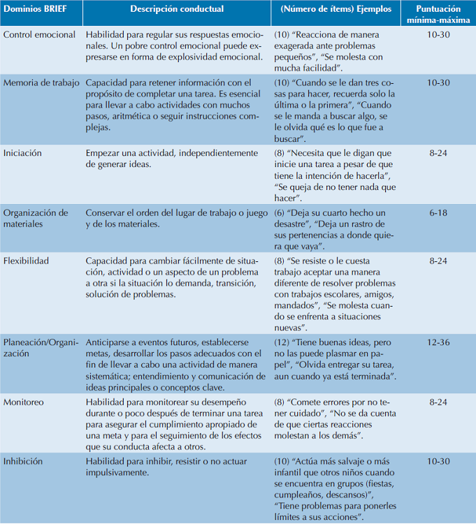 Los 86 ítems del BRIEF se agrupan en ocho dominios de funcionamiento ejecutivo (Cuadro 1). Los resultados se agrupan en dos índices principales: regulación de la conducta y metacognición, además de un índice global compuesto por estas dos dimensiones. También se incluyen dos escalas de validez: de inconsistencia, que indica hasta qué punto el informador contesta coherentemente los ítems parecidos y compara este patrón de respuesta con un grupo normativo y de negatividad, que mide el grado en que el informador responde a ítems seleccionados de modo negativo también en relación a un grupo normativo.19-21 El BRIEF, tanto en su versión original como en adaptaciones hispanas, muestra la misma estructura factorial con una consistencia interna de sus factores entre 0.80 y 0.98.19,22