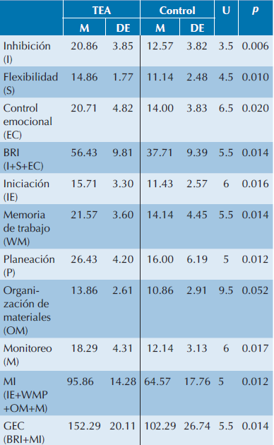 MÉTODO: se incluyeron 14 varones entre primero y tercero de primaria, 50% con diagnóstico de TEA y 50% con desarrollo neurotípico, seleccionados por emparejamiento en edad y grado escolar. El promedio de edad de la muestra fue de 7.43 (DE 0.98) años. Se aplicaron las pruebas de Evaluación neuropsicológica de funciones ejecutivas en niños(ENFEN) y el Inventario de clasificación comportamental de las funciones ejecutivas(BRIEF).