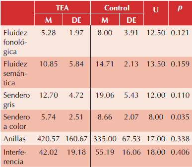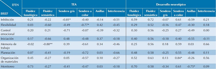 El grupo con TEA obtuvo tres correlaciones significativas (p< 0.05): 1) entre sendero gris e inhibición; 2) sendero a color y flexibilidad y 3) fluidez semántica y memoria de trabajo. Por su parte, el grupo control obtuvo dos correlaciones significativas: 1) entre sendero a color y organización de materiales y 2) entre la prueba de anillas y monitoreo.