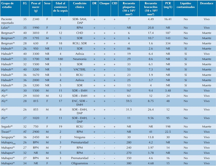 El aislamiento de P. agglomerans en sepsis neonatal no asociada al cuidado de la salud es poco frecuente. Los casos descritos de infección neonatal por P. agglomerans se han presentado en neonatos a término y pretérminos, ya sea como sepsis tardía o temprana.36-44 Los primeros casos reportados se asociaron a brotes por contaminación de infusiones para nutrición parenteral.38 Aunque se han descrito infecciones por otros tipos de Pantoea,45 la infección por P. agglomerans es la más frecuente. En el Cuadro 1 se resumen los casos reportados de sepsis neonatal por esta bacteria con las principales características y se comparan con el caso presentado.
