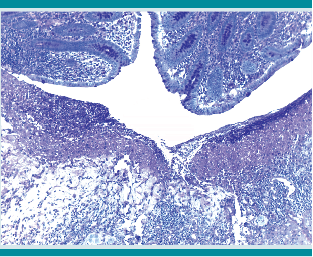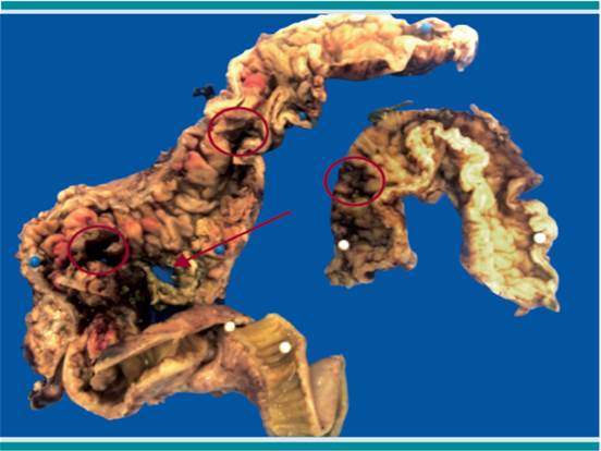 Para el estudio anatomopatológico se recibieron dos piezas quirúrgicas: la primera se envió con el diagnóstico clínico de apendicitis aguda perforada y mostraba al apéndice cecal fragmentado en dos porciones, cubierto por material fibrinopurulento o que se extendía al mesoapéndice. Histológicamente se encontró necrosis isquémica transmural con pérdida de la mucosa y con exudado inflamatorio, predominantemente de polimorfonucleares en el peritoneo y vasculitis importante con trombosis arterial. Días después se recibió el producto de colectomía total en dos segmentos: el mayor de 45 cm de largo incluía íleon terminal, ciego y colon ascendente y el otro, de 15 cm, etiquetado como "sigmoides". Por la superficie externa ambos se apreciaron dilatados y con una extensa zona de necrosis de aspecto hemorrágico en el ciego. Al abrirlo se apreciaron numerosas úlceras, de paredes irregulares de bordes edematosos y fondo amarillento, de tamaños variables de 0.5 hasta 1.3 cm de diámetro distribuidas a lo largo de ambos segmentos. Se identificaron dos grandes perforaciones en el ciego y en el sigmoides (Figura 1).