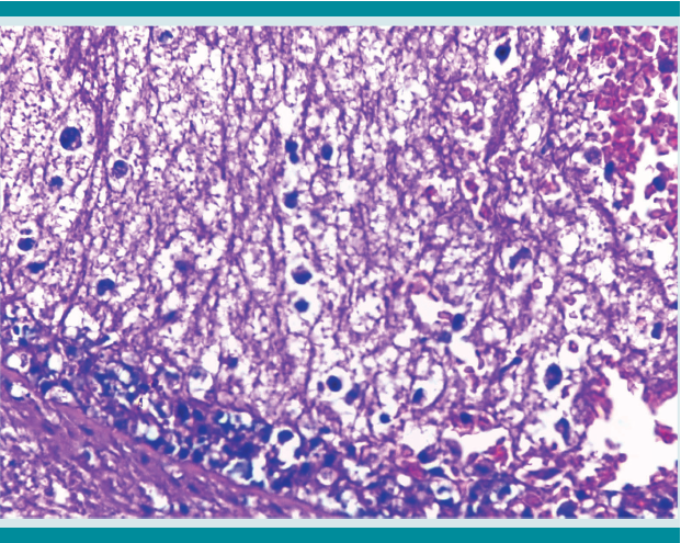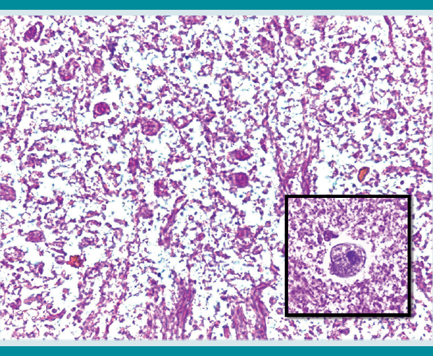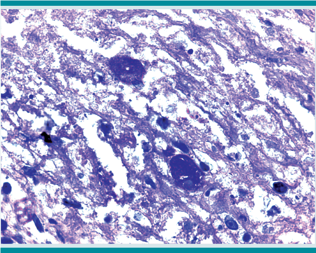 Histológicamente las úlceras tenían bordes limpios ligeramente elevados, de corte abrupto con la abertura luminal pequeña que se continuaba con un fondo amplio que semejaba la forma de un frasco de Erlenmeyer o del perfil de un botón de camisa o mancuernilla y que han sido ampliamente descritas como características de la colitis amebiana (Figuras 2 y 3). La necrosis del fondo de la úlcera estaba bien delimitada del infiltrado inflamatorio mixto y se identificaron numerosos trofozoítos de amibas redondeadas de aproximadamente 20 micras de diámetro de superficie externa, bien delineada, que resaltaba del tejido necrótico adyacente de citoplasma claro antófilo y finamente vacuolado con ocasional eritrofagocitosis (Figuras 4 y 5) que se tiñeron intensamente con tinción de PAS (ácido peryódico de Schiff) (Figura 6). Ante el hallazgo histológico mencionado se revisó nuevamente el apéndice encontrando el mismo tipo de parásitos menos bien conservados.