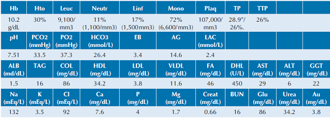 En la Unidad de Terapia Intensiva se refirió taquicárdico, hipotenso a pesar de manejo inotrópico vasopresor y de cargas con coloides. Ventilación mecánica en modo asisto-controlado (AC), manejado por presión con presión inspiratoria de 19 cm/H2, presión positiva al final de la espiración de 5 cm/H2O, fracción inspiratoria de oxígeno al 80%. Tuvo hipoglucemias requiriendo cargas con solución glucosada y se aumentó aporte de glucosa/kg/min. Cursó con hipokalemia por lo que se aumentó aporte en soluciones.