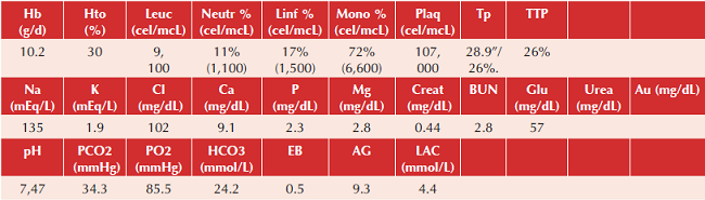 Progresó hacia la gravedad con datos de choque séptico, de necrosis en el estoma y en la herida quirúrgica, con deterioro ventilatorio y hemodinámico, descenso de la cuenta leucocitaria y de plaquetas por lo que requirió intubación y ventilación asistida (Cuadro 2).