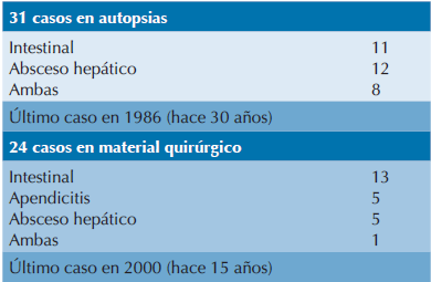 Aunque la amebiasis intestinal sigue estando presente en ciertas regiones de México las formas graves y complicadas, como la colitis ulcerada, el colon tóxico y el absceso hepático amebiano, son patologías muy poco frecuentes y rara vez reconocidas en la práctica médica actual. En el Cuadro 3 se presenta el resultado de una revisión de la casuística de 1971 a 2015, del Departamento de Patología del Instituto Nacional de Pediatría, que concentra los casos de amebiasis graves tanto quirúrgicos como de autopsia. De acuerdo con estas cifras podemos inferir que muchas generaciones de pediatras y cirujanos (y aún patólogos) hayan concluido con éxito su formación sin haber visto nunca un caso de amebiasis como el que ahora hemos presentado.