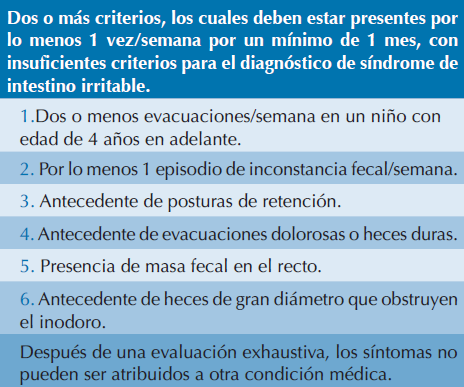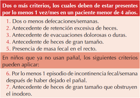 El diagnóstico de constipación funcional es basado en los criterios de Roma IV (Cuadros 1 y 2). Las diferencias entre los criterios de Roma III y Roma IV para constipación son los siguientes: 1) Para niños mayores de 4 años, la duración de los síntomas para el diagnóstico cambió de 2 meses a 1 mes, esto para evitar un retraso en el inicio del tratamiento; 2) Para niños menores de 4 años, se definieron nuevos criterios para niños que no usan pañal, y el síntoma de “incontinencia fecal” se movió a los “criterios adicionales para niños que no usan pañal”, ya que el reconocimiento de la incontinencia fecal en pacientes que usan pañal no es confiable.6,9