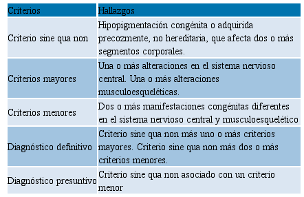 En la mayoría de los casos el diagnóstico se establece clínicamente, con los criterios de Ruiz-Maldonado,2 donde el criterio sine qua non se distingue por manchas hipocrómicas en dos o más segmentos corporales, y como parte de los criterios diagnósticos menores, cualquier malformación anatómica en otros órganos y sistemas diferentes al nervioso central y musculoesquelético.2 (Cuadro 1) En algunos casos la biopsia cutánea puede ser útil para complementar el diagnóstico, al encontrar zonas de piel hipopigmentada, con disminución o ausencia total del pigmento cutáneo secundario a la baja concentración de melanocitos, sin infiltrado inflamatorio.10 En el paciente de este estudio se estableció el diagnóstico temprano, en los primeros meses de vida, al identificar el criterio sine qua non de la enfermedad, así como malformaciones en el sistema nervioso central, que posteriormente se sustentó con los hallazgos en la biopsia cutánea. Sólo 50% de los pacientes manifiesta las manchas hipopigmentadas características desde el nacimiento.4
