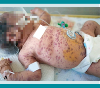 Lactante de 6 meses de edad, enviada para valoración al servicio de Trasplante de células progenitoras hematopoyéticas del Instituto Nacional de Pediatría. Entre sus antecedentes personales: la madre de 24 años, primer embarazo, evolución normal, parto eutócico, peso al nacimiento 3 kg, talla 48 cm y Apgar 8/9. Desde el nacimiento se identificó dermatosis maculopapular generalizada, con nódulos subcutáneos infiltrativos violáceos en todo el cuerpo. (Figura 1) Se estableció el diagnóstico presuntivo de síndrome de neonato blueberry-muffin; además, se encontró hepatomegalia y esplenomegalia. La biometría hemática reportó hiperleucocitosis (215,900 leucocitos/mm3), a expensas de 75% de blastos, con inmunofenotipo de expresión: CD45+, MPO+, CD33+, CD13+ y CD14+, compatible con leucemia mieloblástica aguda.