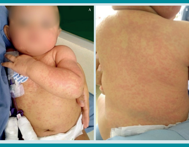 Historia clínica de erupción roja maculopapular en todo el cuerpo (generalizada).