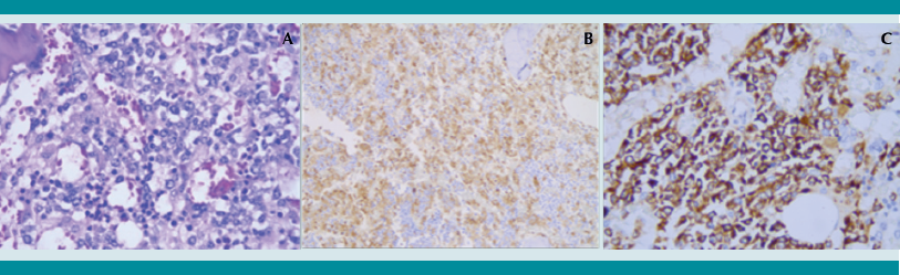 Se realizó la autopsia completa. En el examen externo se observó: abdomen distendido a expensas de 100 mL de líquido hemorrágico; ictericia y petequias que afectaban la piel y las mucosas. Debido al antecedente de quimioterapia mieloablativa la médula ósea mostró celularidad aproximada de 30%, con relación mieloide-eritroide de 6:1, por detención en la maduración de la serie mieloide. El resto de la celularidad estaba representada por macrófagos, incluso algunos contenían eritrocitos intracitoplasmáticos (Figura 4). También se evidenció hipoplasia linfoide grave generalizada en el bazo, los ganglios linfáticos y el timo. En el páncreas se encontraron dos nódulos de células acinares (nódulos de células acinares atípicas, transformación acinar focal, degeneración eosinofílica, displasia focal de células acinares) asociadas con la quimioterapia en diferentes neoplasias.17