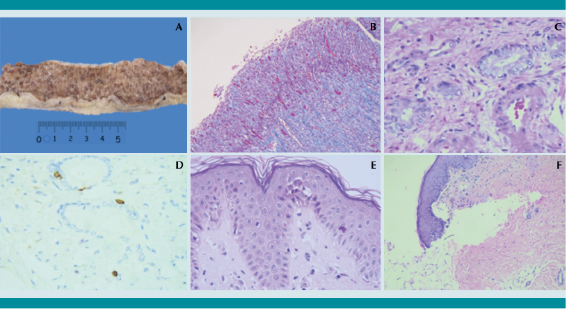 El examen microscópico reportó daño en los conductos biliares por linfocitos T citotóxicos, con fenómenos secundarios acentuados de vacuolización citoplásmica, pleomorfismo nuclear, pérdida de núcleos y desprendimiento-necrosis de células epiteliales; las células epiteliales residuales estaban atenuadas y de aspecto escamoide; los hepatocitos exhibían necrosis, colestasis y esteatosis en la zona 3 (grado histológico II, de acuerdo con la escala de Banff).22 En el tubo digestivo se observó ulceración del tercio inferior del esófago, con disqueratosis de la mucosa adyacente; el intestino delgado tenía dilatación global, con ulceración difusa y desprendimiento de la mucosa relacionado con tejido de granulación prominente; se clasificó en grado IV, de acuerdo con la clasificación modificada de Lerner.23Figura 5